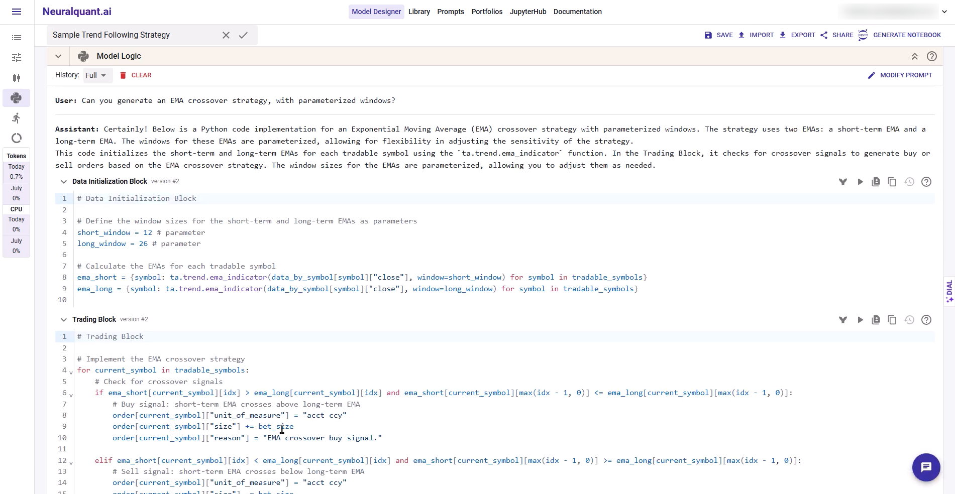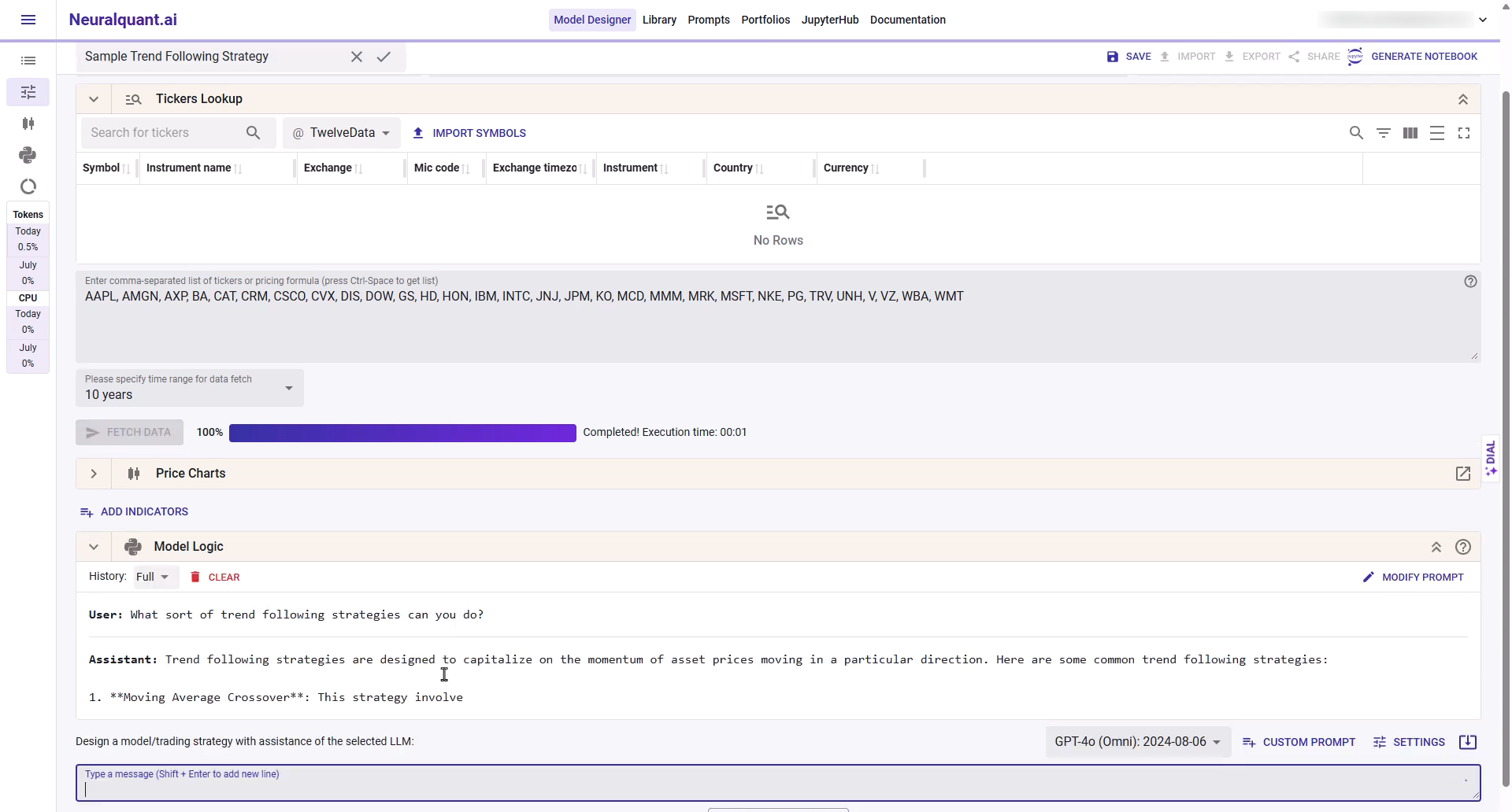 Neuralquant integrates with the DIAL platform to acquire a direct access to different LLMs, enriching existing models with domain-specific context. This allows users to automatically generate strategies, converting ideas into executable Python code.