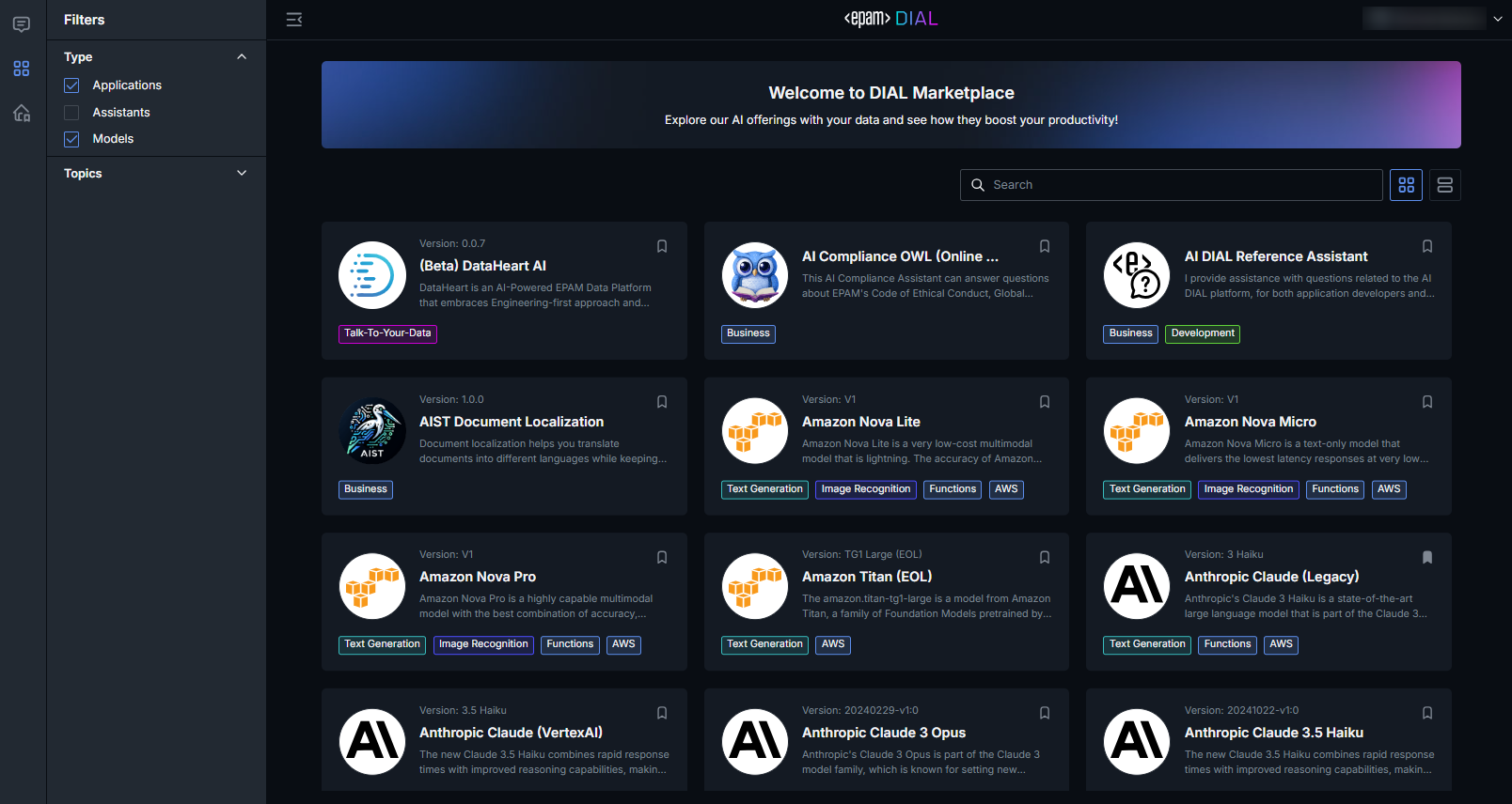 DIAL Chat features a built-in Marketplace—a centralized hub for accessing applications, agents, tools, and AI models. The user’s workspace offers no-code and low-code tools, enabling rapid creation, customization, and testing of applications with ease.