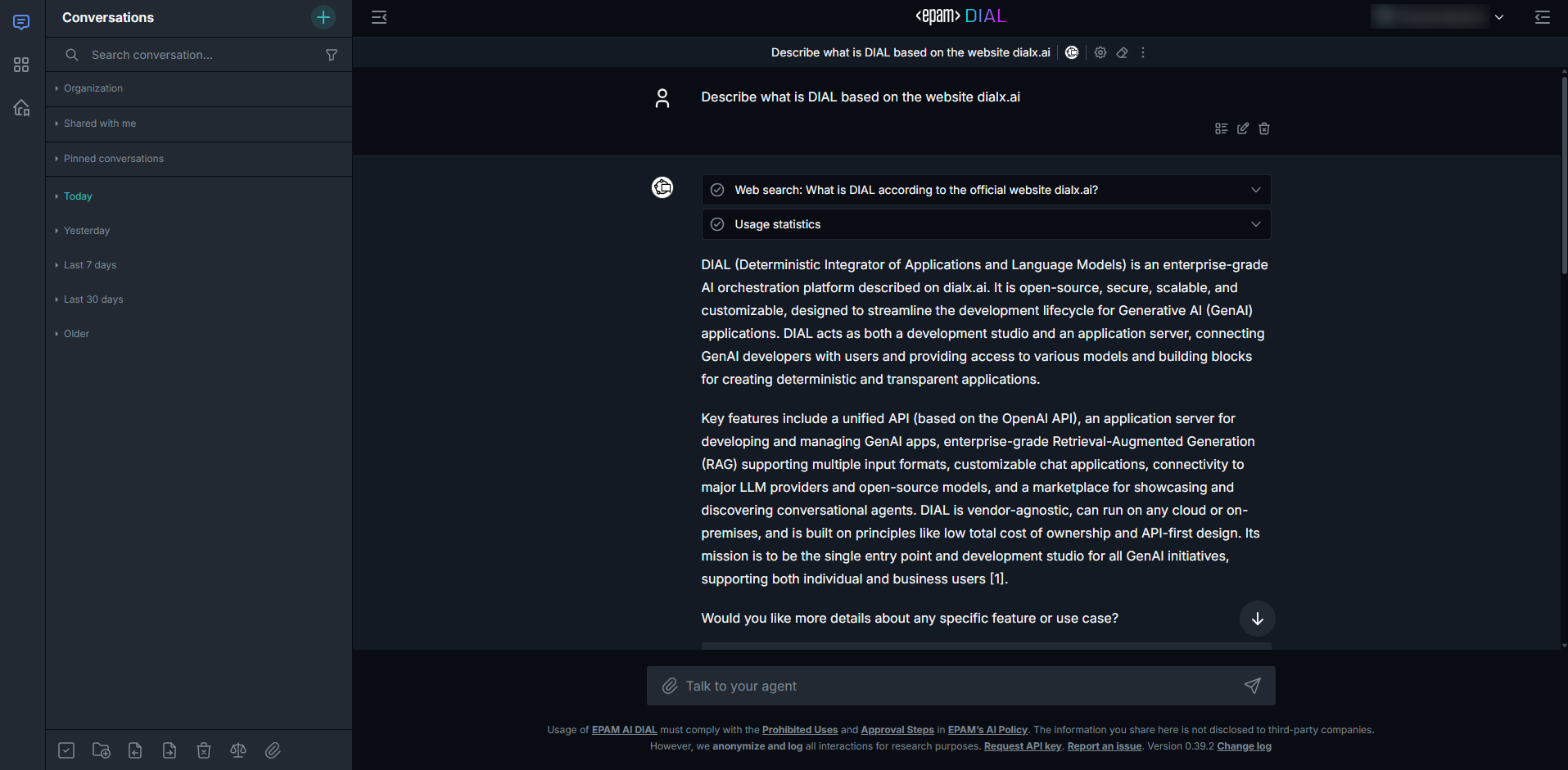 DIAL Chat is the default conversational interface of DIAL with tools to effortlessly manage chats, prompts, files, toolsets and AI agents.