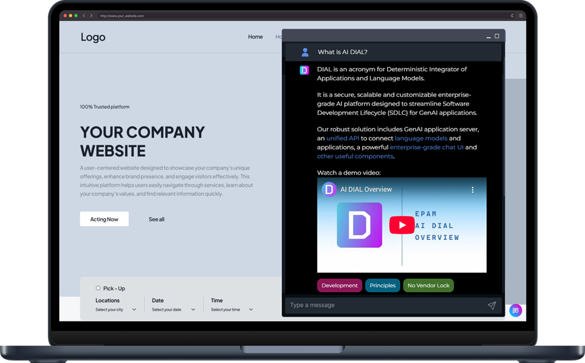 The DIAL Chat Overlay lets you embed a full-scale chatbot into any application using an iframe—no development required.