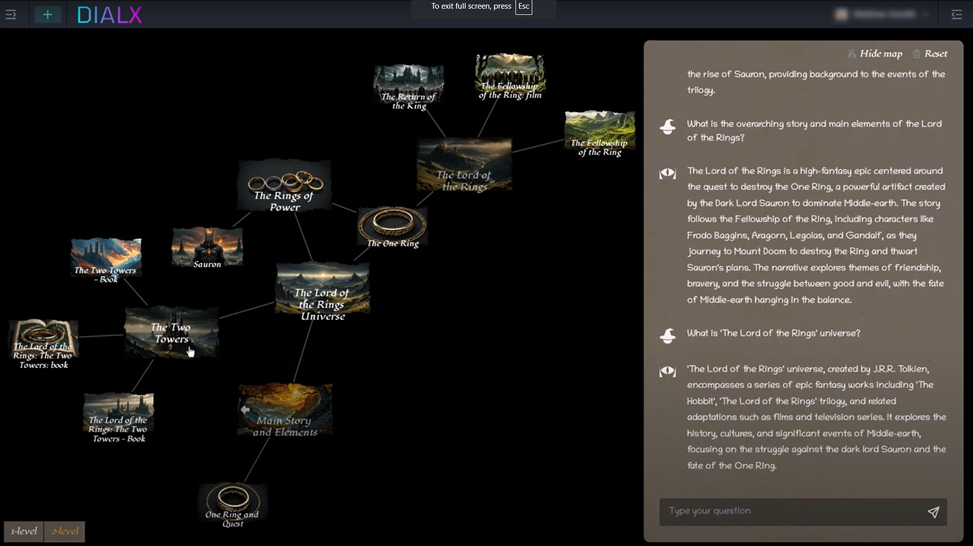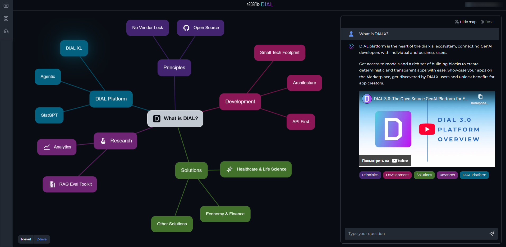 DIAL Mind Map UI complements the visual knowledge graph with an AI chatbot that helps explore information through conversation. As you chat, the system automatically navigates to relevant nodes on the knowledge graph, creating a seamless exploration experience.