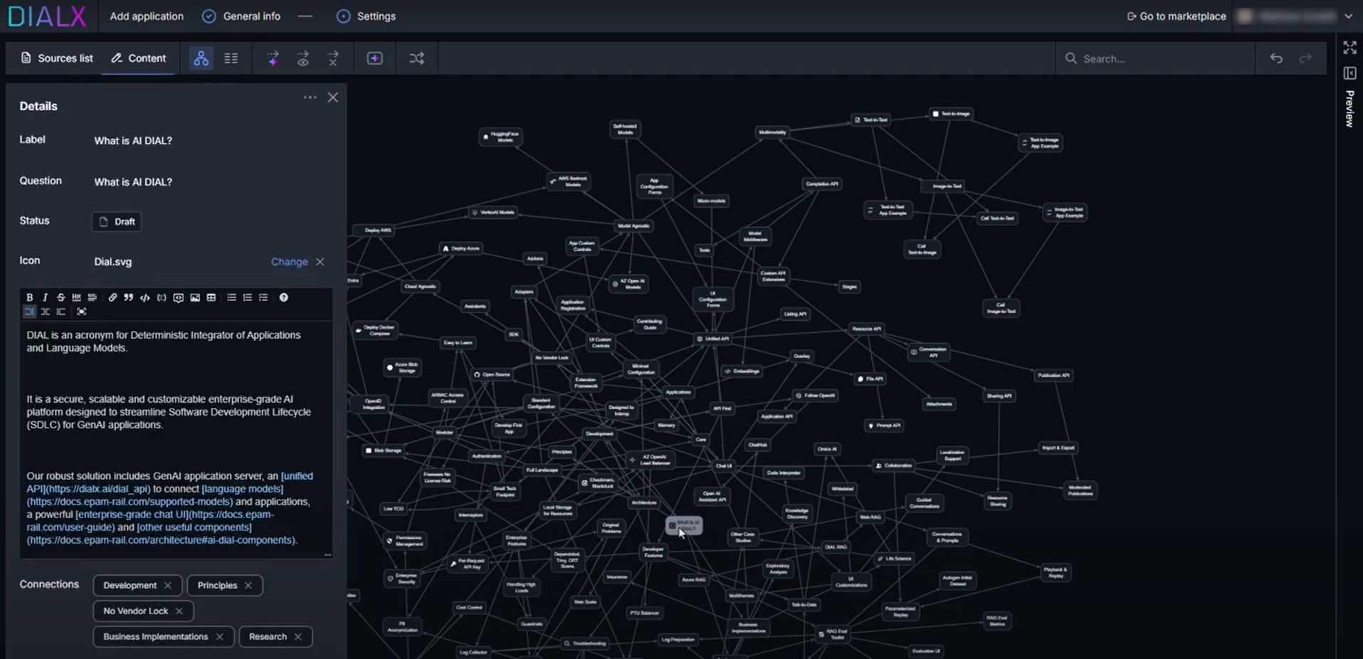 DIAL Chat includes an intuitive and feature-rich Mind Map Studio, where users can generate knowledge graphs in a few clicks. It enables real-time collaboration, manual and AI-powered extension of knowledge graphs with additional sources, nodes and relationships.
