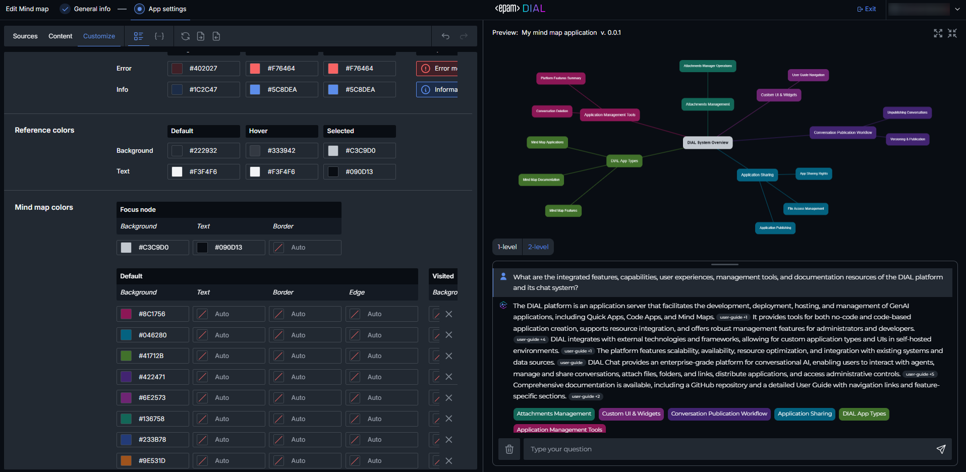 DIAL Mind Map Studio allows DIAL Chat users to create interactive and fully custom knowledge graphs from the provided sources.