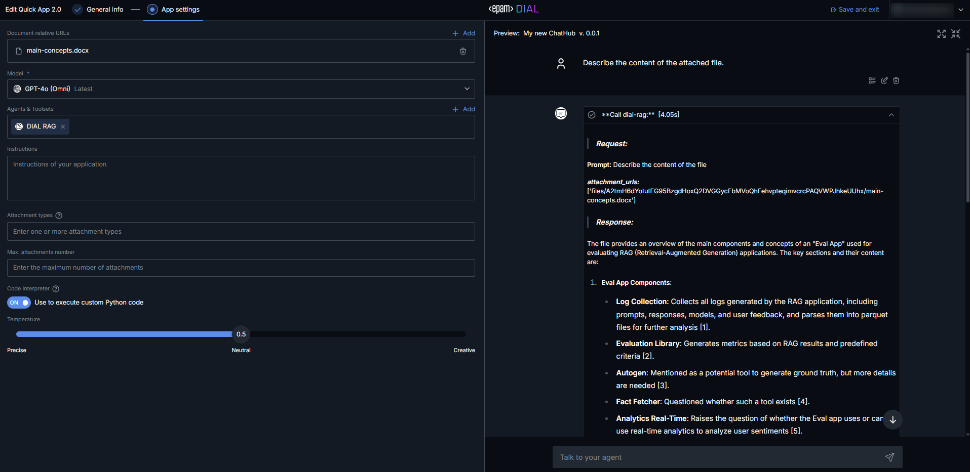 DIAL includes RAG Evaluation Toolkit with intuitive UI and powerful libraries allowing to assess the quality of information retrieval and generation of any RAG-like application based on various metrics, compare performance of different apps side-by-side, visualize results and much more.